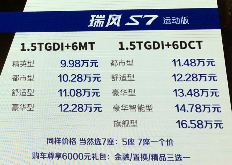 瑞风S7运动版 指导售价车型售价1.5T 手动精英型9.981.5T 手动都市型10.281.5T 手动舒适型11.081.5T 手动豪华型12.281.5T DCT都市型11.481.5T DCT舒适型12.281.5T DCT豪华型13.481.5T DCT豪华智能型14.781.5T DCT旗舰型16.58
