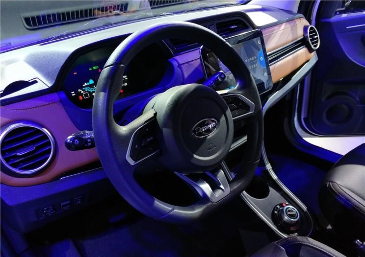 内饰的设计上,和当下很多这种纯电动微型车很相似,走简洁时尚的路线。除了空调控制面板,其它的功能均融入到多媒体系统中,由一块10英寸的触摸屏来完成各种功能的操作。