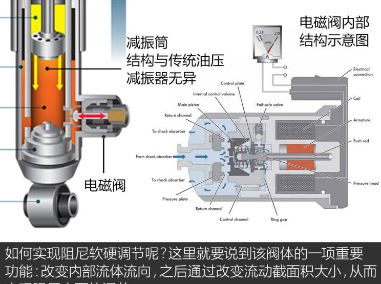 由于采用了电磁阀执行减振器软硬的调节,故其调节速度还是十分可观的。除了驾驶员可以手动执行悬架软硬的选择之外,对于路面反馈回来的一些路况数据,它还可以执行实时调整,也就是说,手动选择的悬架软硬仅仅是选定了减振阻尼范围,而具体减振器阻尼反馈是一个时刻都在调整的过程。