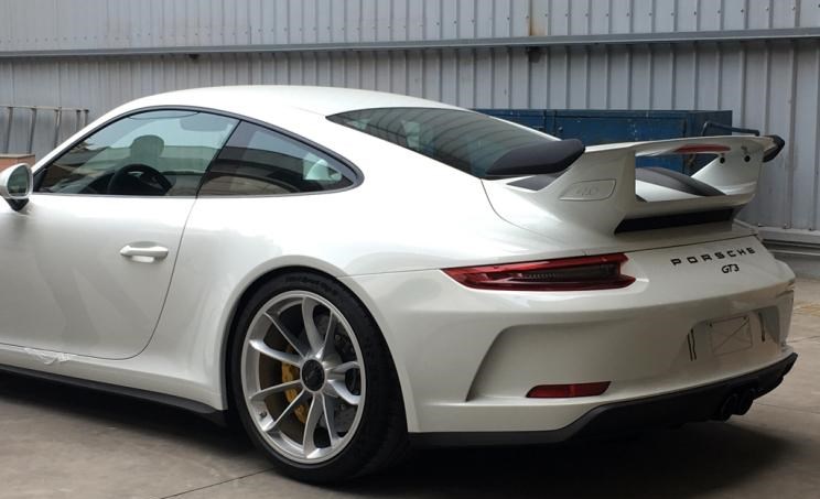 外观方面,与其它的新款911车型一样,新款911 GT3换装了全新造型的前保险杠,其上配备有尺寸更大的进气口,运动风格更加激进。与此同时,新车配备的双五辐式轮圈样式与老款车型较为相似,并且同样为中央锁止式设计,内部黄色的大尺寸制动卡钳格外显眼。