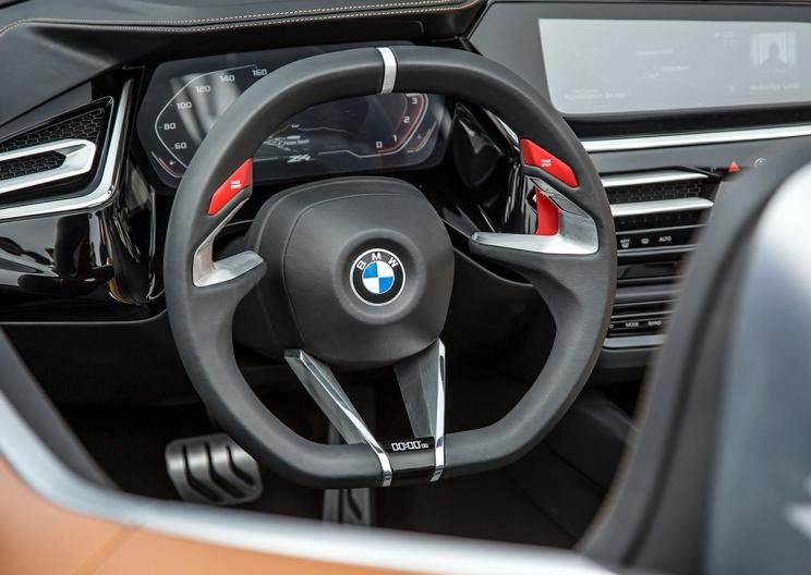内饰部分,全新Z4概念车采用了黑色+驼色搭配的配色方案。中控区域呈现包裹驾驶员的环绕式设计,搭配风格大变的线条、全新的多边形全液晶仪表、运动风格十足的四辐式平底式方向盘等,使得中控台的战斗气息十分浓郁。在下部中控台的挡把区域,新车采用了全新样式的挡把设计,其造型已经完全摒弃了现行的“鸡腿”电子挡把,并且新车的iDrive系统控制区也发生了变化,按钮更加扁平化。