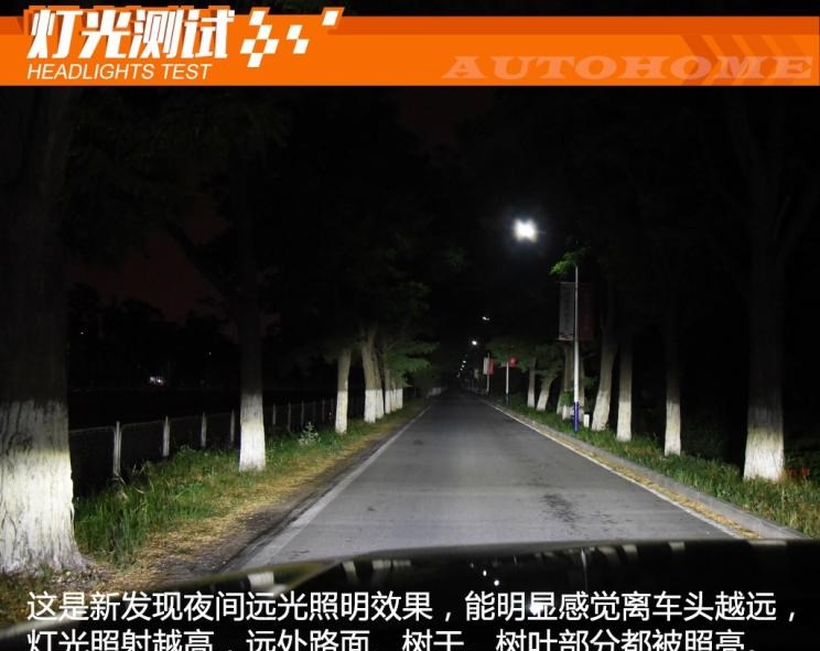 新发现近光灯最大照射范围达到45m,多数驾驶员夜间开车视线受阻,观察前方道路距离缩减到30m左右,所以近光照射距离足够使用。在测试时我们发现这辆车在近光模式下车头左右两侧被照亮的区域比一般的车大,这就引起我们极大的兴趣。