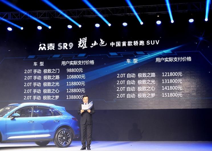 2016年11月11日,众泰旗下全新中型SUV——众泰SR9正式上市,此次手动挡和自动挡共推出9款车型,均采用2.0T发动机,售价区间为10.88-16.18万元,此外,厂家对前50000台购车用户将给予10000元补贴,具体车型售价及补贴后的售价请参看下表: