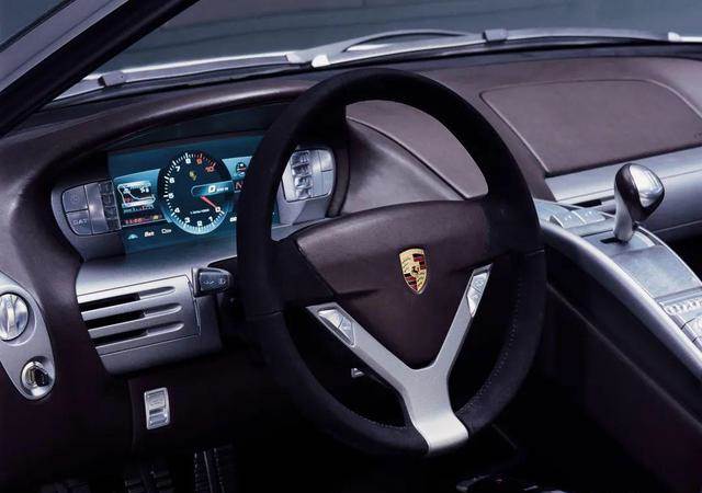 (图:概念跑车选用了显示屏式的车内仪表盘,之后的批量生产车里改成了保时捷传统式的“五桶式”机械设备表针仪表盘)