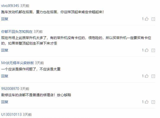针对这一件事儿,许多车友们也发布了自身的观点。大伙儿感觉可能是升降机太伪劣了,才导致了那样的状况。也是有可能是法拉利的重心点后面,职工实际操作不善,因此 才翻了车。