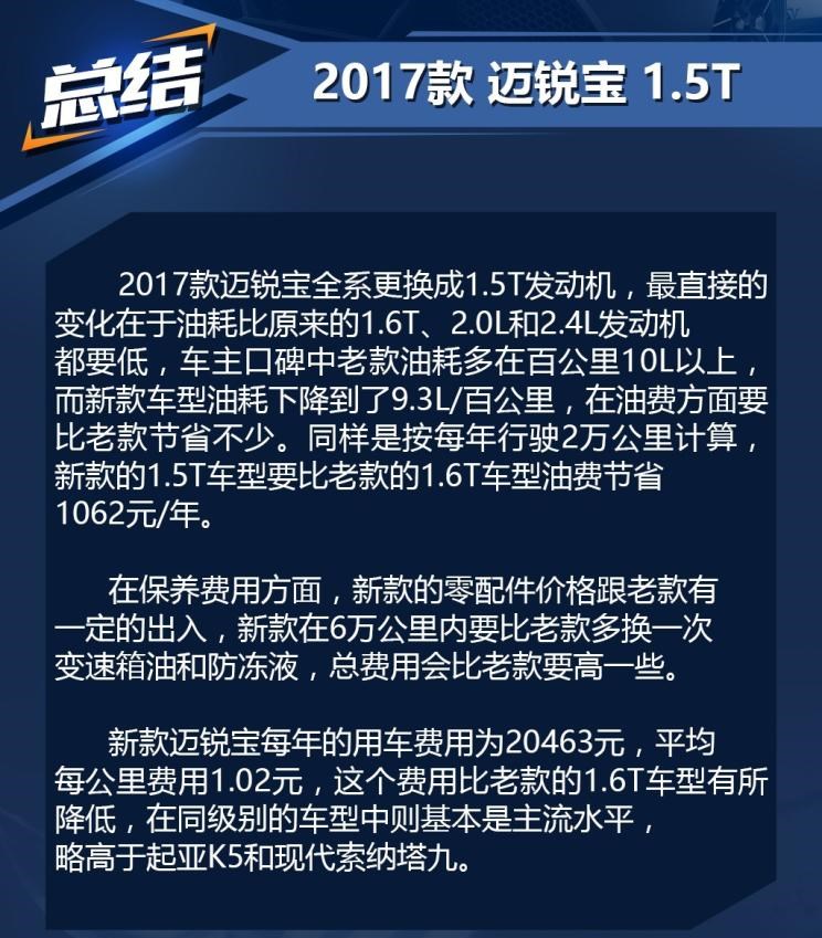 通过上述分析可见,迈锐宝 1.5T车型在保养配件方面跟老款有所出入,主要是三滤的价格有所变动,机油和变速箱油等价格基本不变,工时费稍有下降,保养周期和项目跟老款基本相同,主要是增加了更换变速箱油和冷冻液的项目,整体保养费用稍高于老款车型。