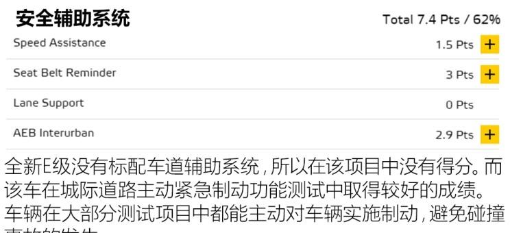 进行碰撞测试的全新E级是一台标准版车型,没有配置车道辅助系统。而该系统正好是此项目中的加分项。这使得新车在安全辅助系统项目中没有取得高分。总体来说,全新E级在碰撞保护性能上处于同级车领先的水平,如果能在标配车型上增加更多的配置将进一步增加该车的安全性。