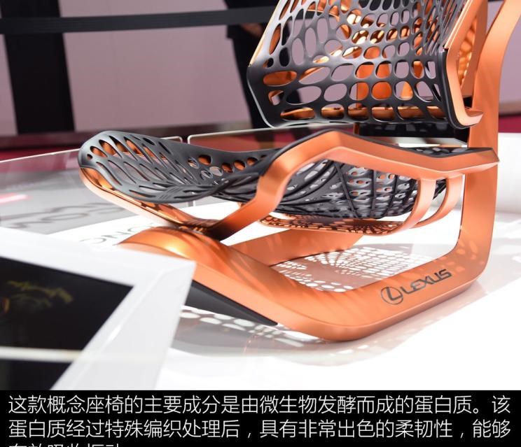 在2016巴黎车展的现场,雷克萨斯发布了一款名为“KINETIC”的概念座椅。这款座椅的靠背和坐垫区域采用了环保的合成蜘蛛丝材料制造。该概念座椅的坐垫和靠背通过模拟人类运动时盆骨和胸腔的反向运动,保持了乘员头部和视野的稳定性,增强了乘坐舒适性。