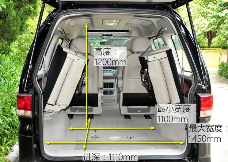 该车采用2+2+3的座椅布局,除标准型外座椅均采用皮革包裹,海绵填充饱满。后排乘客乘坐空间宽裕,乘坐感较为舒适。后备厢在第三排座椅正常情况下可满足日常接待使用,待座椅翻折后可装载更多物品。