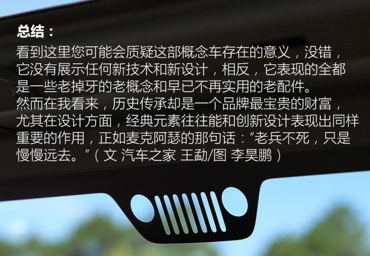 Jeep牧马人75周年致敬概念车的确有点离经叛道,因为它并未如其他概念车那样展望未来,相反,它的意义在于回忆过去。您可能觉得这样做没什么意义,但我却一直觉得,历史上的经典车型对一个品牌意义重大,它们不光是情怀,在设计方面更有很强的借鉴意义,正如麦克阿瑟的那句著名演讲——“老兵不死,他们只是慢慢远去。”