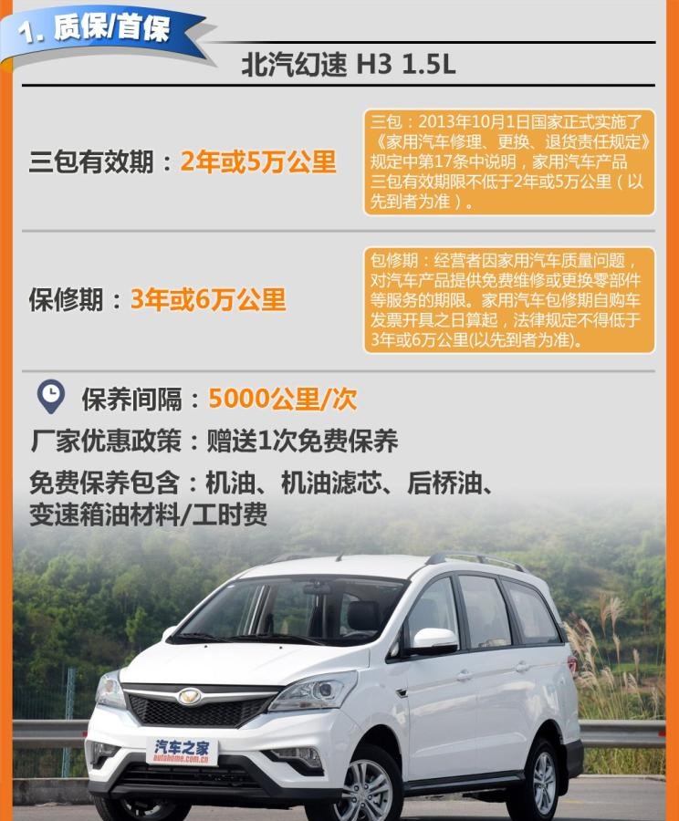 本次我们采集了北汽幻速H3的详细用车费用,按照每年行驶1.5万公里把保养、保险以及油费三项相加之后,幻速H3每年使用费用总计12403元,均担到月为1033元/月,按照公里数折算约合0.83元/公里,这样的用车成本使得大部分车主都能够承担。而由于这款车仅有1.5L手动车型一款配置,因此幻速H3的3款不同配置车型在用车费用上其实是一样的。并且由于保险费用带来的价格差异相当小,广大幻速H3的车主可以从这篇文章里对自己爱车的保养价格有一个比较直观的估算。