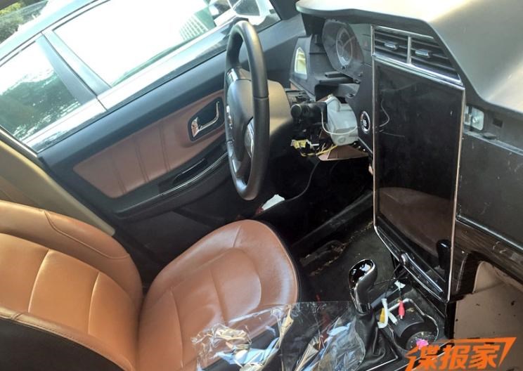 车内的变化更多。首先是黑棕双色混搭的风格是现款车型没有的,其次是增加了一键启动系统,而最重点之处则是多媒体系统换装了一块尺寸超级大的触摸屏。虽然目前还没有这块触摸大屏的具体参数,但从它与中控台的比例来看,个人猜测其尺寸甚至会超过特斯拉MODEL S的17英寸大屏幕。