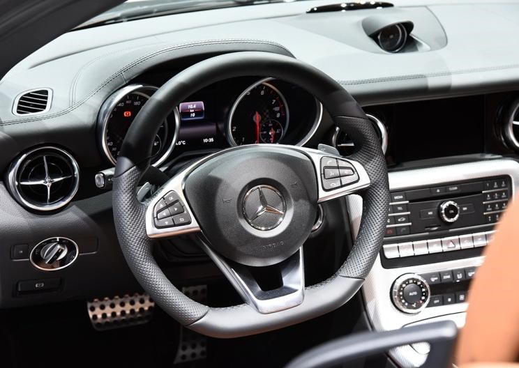 内饰部分,奔驰SLC配备了最新的三辐式多功能方向盘,前方为炮筒式仪表盘设计。中控台部分,中央顶部为一块7英寸液晶显示屏,两侧为圆形出风口,这与奔驰家族式设计基本相符,底部拉丝金属覆盖大量面板,中央的多媒体控制区域与底部空调旋钮基本与老款车型一致。另外,奔驰SLC并未运用怀挡设计,而是配备了传统排挡杆。