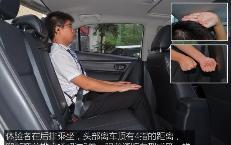 由于雷凌双擎并没有针对车身造型进行调整,所以其内部空间表现与普通版保持一致,身高172cm的体验者坐进前排时,头部空间为一拳,同样的体验者坐进后排时,头部空间为四指,而腿部空间则超过两拳,空间表现还是非常不错的。