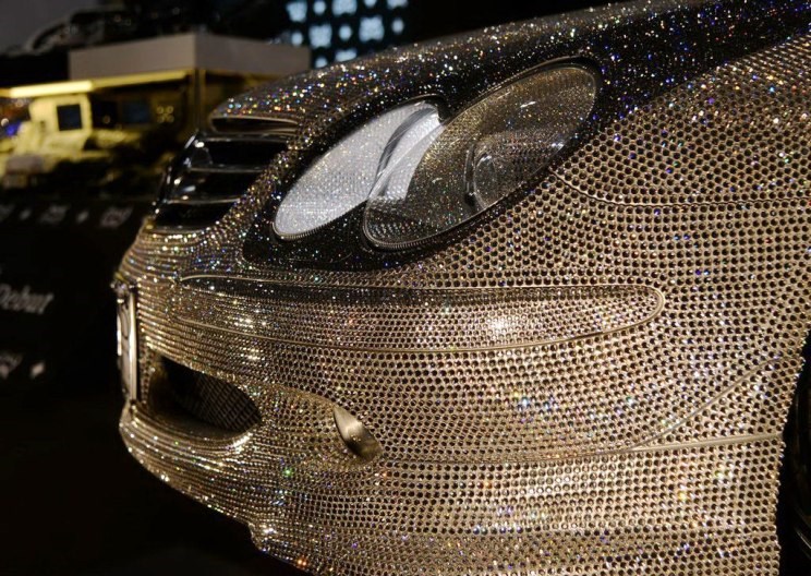 语言已经无法形容,图中可以看到这辆奔驰全身贴满了水晶,就连大灯内部、轮圈上都贴满了水晶饰品。无需多言,直接看图吧。