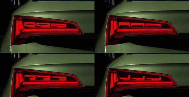 在新款奥迪Q5上,其尾灯组采用了数字OLED大灯,其支持多种显示方式,主要区别在于L型的灯带右侧灯珠的造型,不过其内部均加入了熏黑的设计风格,在夜间点亮后辨识度极高,所谓“灯厂出品 必属精品”。值得一提的是,这套灯光系统还能提升车辆安全性,当后方车辆接近车尾2米以内时,尾灯的所有发光单元都会以最大亮度警示后方。