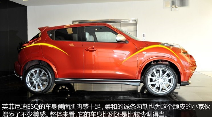 ESQ是英菲尼迪基于日产Juke Nismo车型打造而来的车型,其外形方面基本保留了Juke Nismo的设计,整车看上去十分个性。ESQ只是在细节部分进行了改进,其最明显的区别则在于新车前中网进气格栅位置镶嵌有“ESQ”标识,这直接证明了该车的身份。