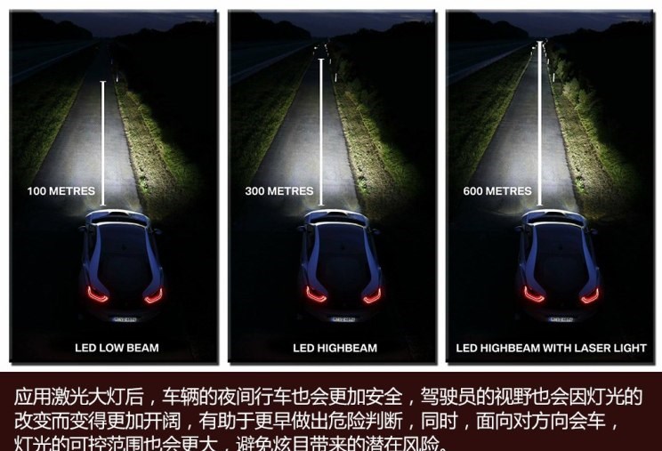 当氙灯还没成为标配,LED也仅仅是少数车型的专利的时候,宝马又将激光大灯放到i8上并推向市场。虽然目前激光大灯尚处于推广的初期阶段,但宝马还是很有信心继续推广,毕竟这个产品在亮度、效率、能耗以及体积方面的确相比LED灯有很大的优势。我想如果您对宝马推广激光大灯的态度还有怀疑的话,那么宝马在宣传i8激光大灯的时候有一句广告词:Now with laser headlights