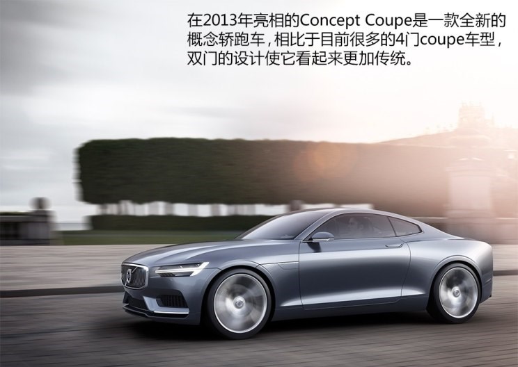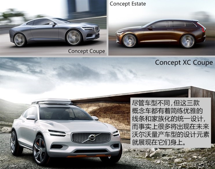 沃尔沃在2013年推出了全新的概念轿跑车Concept Coupe,这辆有着优雅外形和全新设计语言的双门跑车看起来与现售的沃尔沃车型有着很大的区别。而在2014年,沃尔沃又推出了Concept XC Coupe和Concept Estate,这三台概念车一起展示出了未来沃尔沃在外观和内饰中的设计理念和趋势。