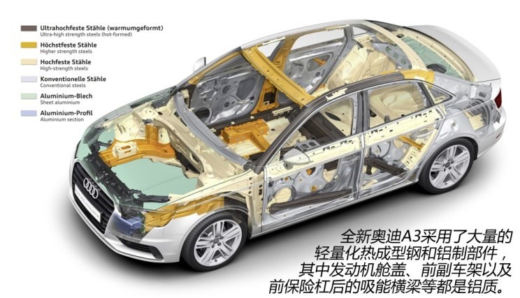 除了轴距有变化之外,奥迪全新A3还采用了被称为ultra的轻量化科技,车身使用轻量化热成型钢和大量铝制材料减重70kg。