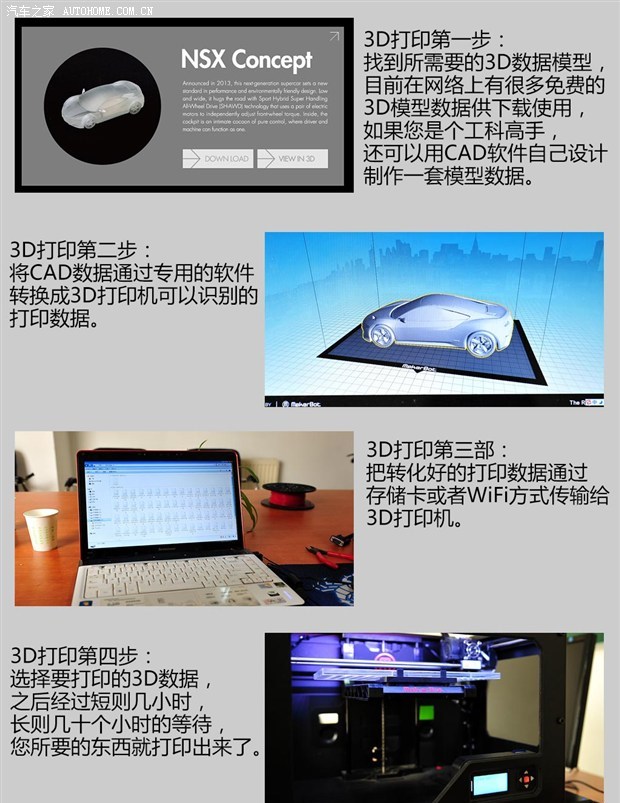 2个小时打印一台也就是火柴盒大小的“车”,似乎速度有点慢,但科技就是从慢到快发展的,目前3D打印机已经在工业设计、医疗等方面有了用武之地,而从我们现在了解到的信息,诸如福特、本田、大众的研发设计部门都已经开始使用3D打印机来打印相关的零件做验证甚至是打印一台完整的车来验证车辆的空气动力学特性等重要参数。不过工业设计离我们还比较远,其实我们能接触到的日常3D打印无非就是文章中提到的打印车模这种情况,所以如果通过介绍您对3D打印比较感兴趣不妨买一个3D打印机自己在家搞搞创作,说不定能打印一个“苍老师”呢。<3D打印机购买链接>