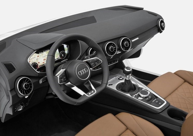 内饰延续了TT车型的设计语言,平底方向盘和圆形空调出风口都得以延续。仪表由一块12.3英寸的TFT液晶屏构成,仪表和信息娱乐显示屏合并,行车和相关信息都显示在这块屏幕上。