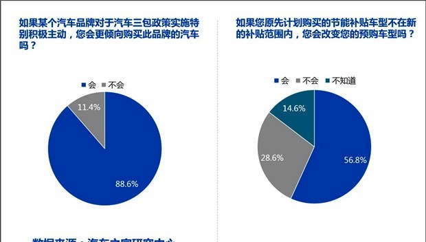 对于众多车企提前实施三包的行为,88.6%的消费者表示如果某一汽车品牌对于汽车三包执行采取特别积极的态度,会更倾向购买这一品牌的汽车。针对新节能补贴的调查,从计划购买1.6L排量以下车型的消费者来看,新的政策对他们的购车决策具有相当大的影响。56.8%的消费者表示如果原先计划购买的节能补贴车型不在新的补贴政策内,则会改变自己的计划,从而选择享受国家3000元补贴的节能车型。从汽车之家研究中心的调查结果来看,这两项政策对于消费者的影响几乎是立竿见影。