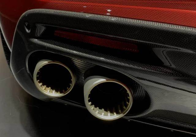 排气管为双边共4出,内部有非常明显的槽状设计。后保险杠同样采用碳纤维材质,进行了复杂的安全和空气动力学造型,反正一看就是不好惹的样子。