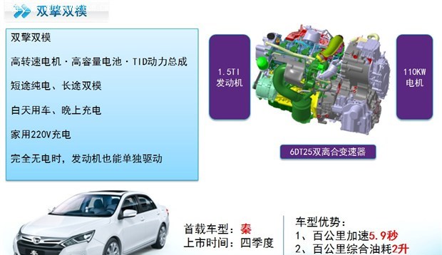 比亚迪的双模电动车还将进一步发展,秦将于今年第四季度广州车展上市。比亚迪唐将于明年推出,预计是在第二季度到第三季度期间,该车采用2.0TID+电动机,0-100km/h的加速为4.9秒。