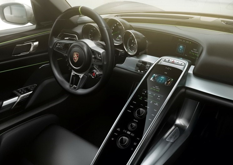 内饰方面,保时捷为918 Spyder赋予了全新的内饰设计。中控台与前排座椅中央扶手相连,触控式按钮与可升降的大旋钮组合而成的中控台很有科技感。操作区和中控台前部都带有大尺寸液晶屏幕。918 Spyder的排挡杆简化为一个小的拨杆,位于方向盘右侧。全新的三辐式运动方向盘和三炮筒式仪表盘,营造了动感的内饰氛围。