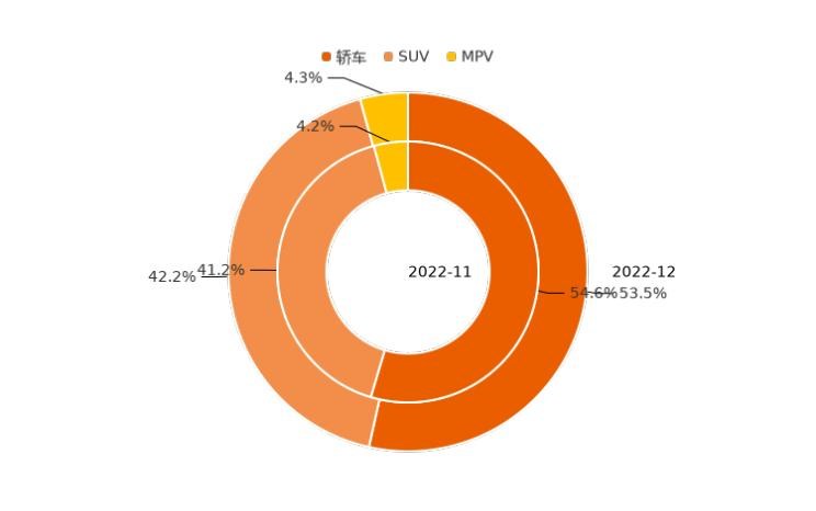12月,轿车、SUV、MPV用户购车意向占比分别为53.9%、41.9%、4.2%。轿车用户意向占比相较上月下降0.9%,份额开始回落。SUV用户意向占比开始转跌为升,环比增加0.6%。MPV用户意向占比开始转跌为升,12月环比上升0.3%。