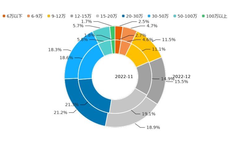 通过分析近12个月的用户意向数据发现,2022年1月至12月,12万以下价区用户意向占比降低7.2%,随着人们收入水平提高, 低价市场需求有所萎缩 ;12-20万价区用户意向占比上涨1.6%,市场热度保持小幅增长;20万以上价区意向占比,上涨5.7%,其中,20-30万市场热度保持一定增长,得益于汽车用户置换升级需求的带动,近12个月用户意向占比上涨2.9%。未来,消费升级及汽车置换周期的到来,将进一步利好中高端市场的发展。