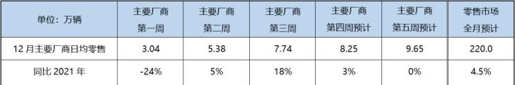 12月以来,疫情防控措施发生巨大调整,各地放松管控,前期车市压抑刚需快速回补,主要厂商零售第一、二、三周的日均同比分别为-24%、5%、18%。临近年末,燃油车购置税优惠和新能源补贴政策即将到期,终端维持快速交车节奏,预计第四周市场延续第三周增长走势。考虑到各地感染高峰的到来,消费者行为比较谨慎,聚集性活动和出行减少,年底翘尾效应可能受到抑制,第五周预计日均零售同比与去年持平。综合估算12月零售将达到220.0万辆。