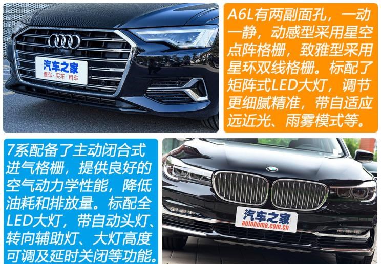 外观方面,新款A6L采用了双前脸设计,动感型拥有现代感十足的“星空点阵”浮动镀铬进气格栅,致雅型拥有充满高级感的“星环双线”双薄片进气格栅,一动一静气势不凡。7系同样提供了两种外观风格,M运动套装和卓越套装。灯光配置方面,A6L和730 Li领先型都标配了全LED大灯,具备自动头灯、大灯高度可调、大灯延时关闭功能。A6L的矩阵灯组调节更加细腻精准,还带自适应远近光、雨雾模式和大灯清洗。730 Li领先型则具备转向辅助灯、LED雾灯。